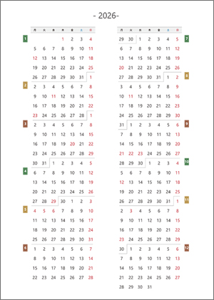2026年用 年間連続カレンダーA4サイズ【月曜始まり】(PDF/87KB)